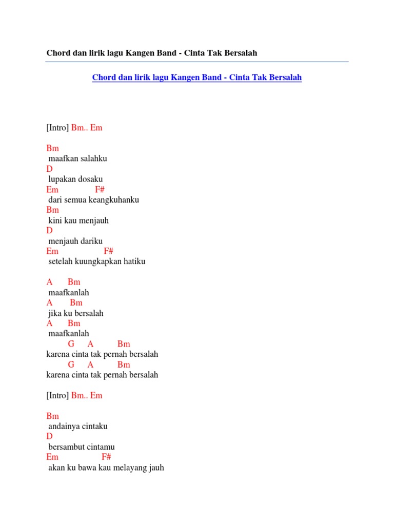 Chord Dan Lirik Lagu Kangen Band Cinta Tak Bersalah