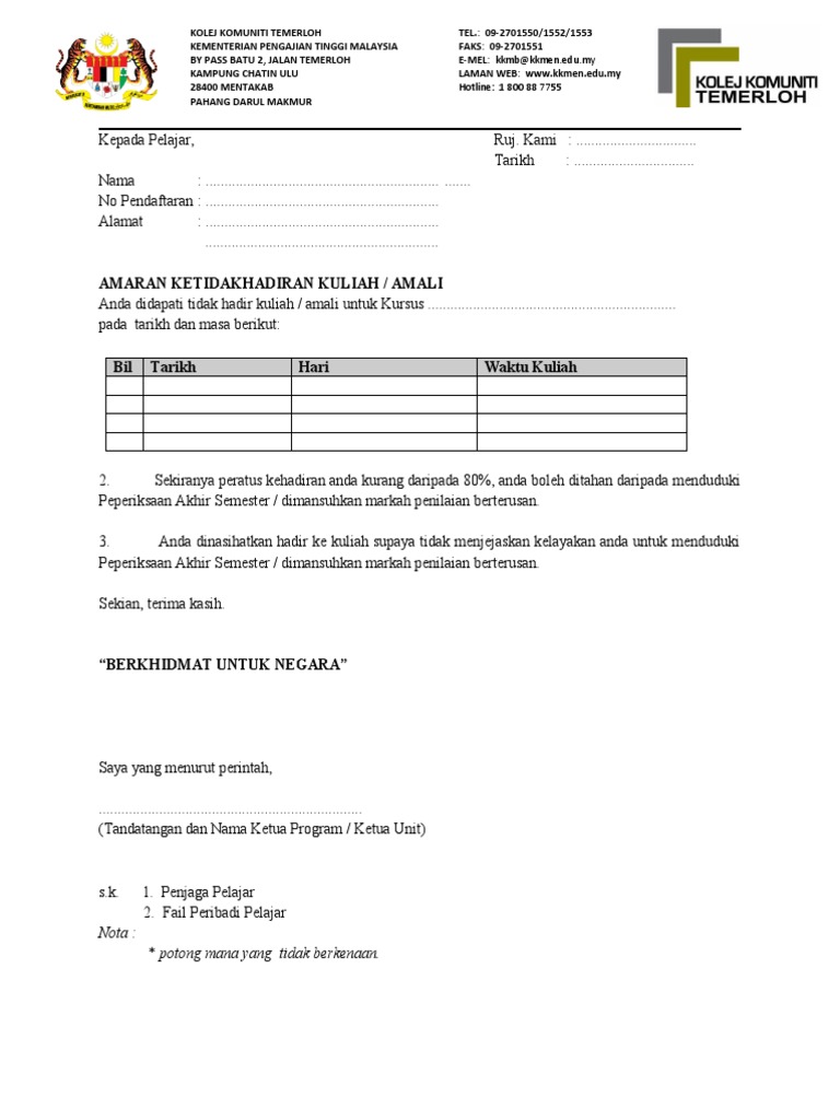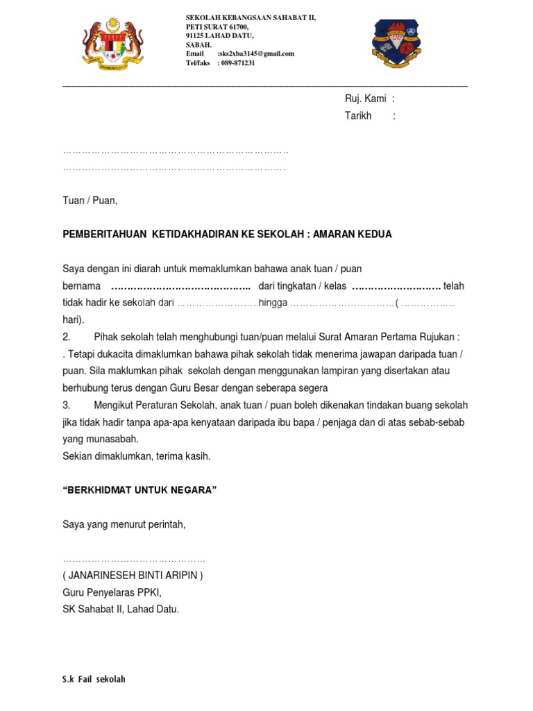 Surat Amaran Tidak Hadir Ke Sekolah Doc