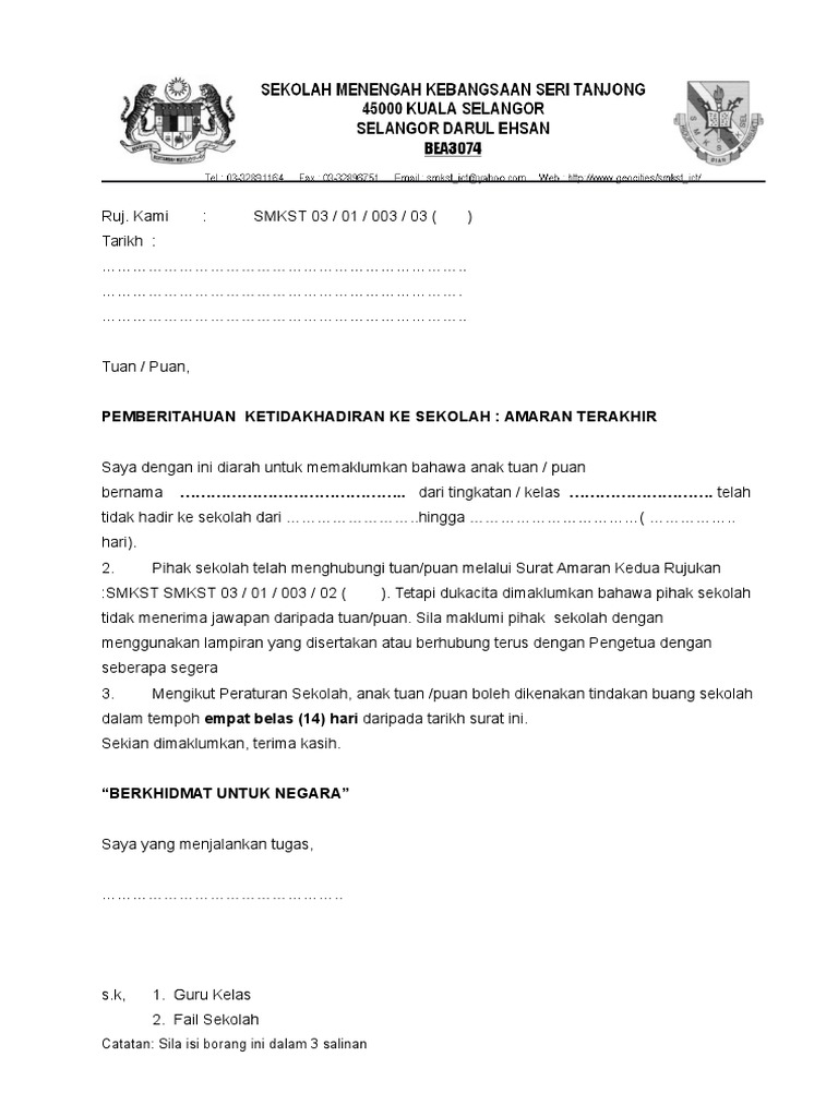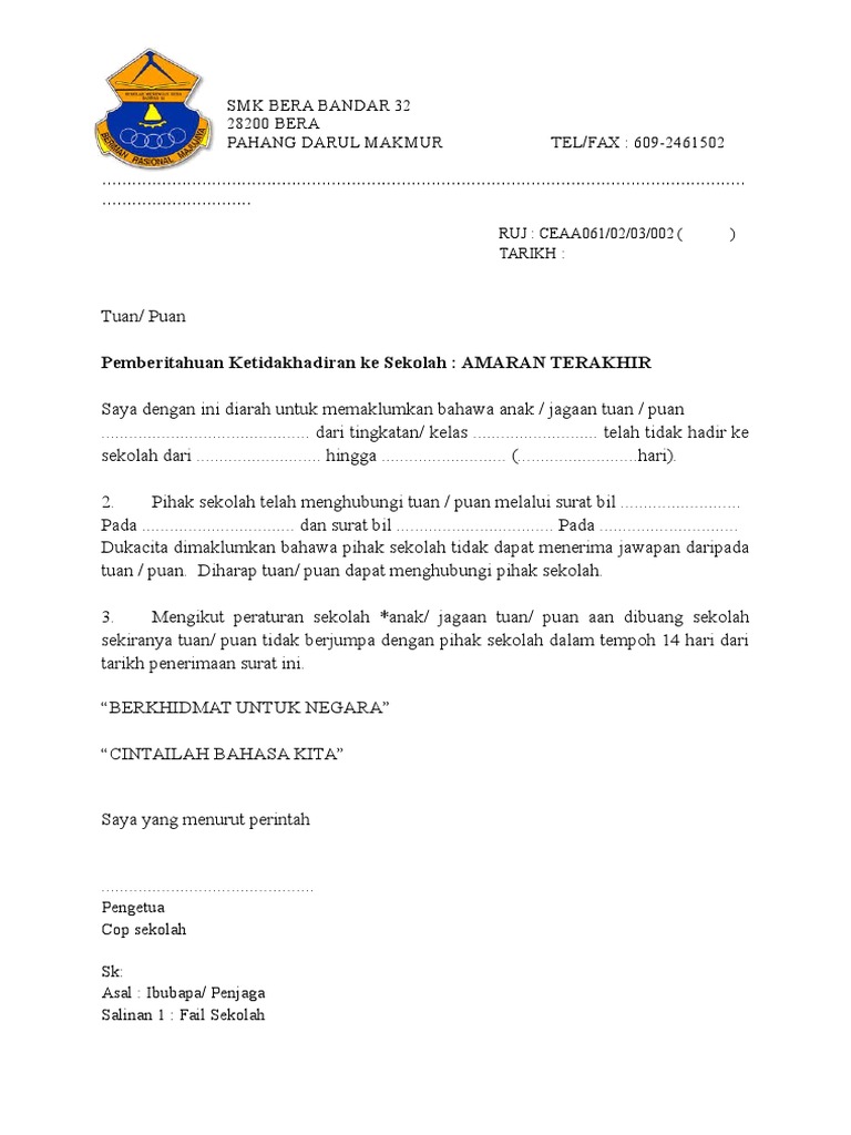 Format Surat Amaran Terakhir Untuk Ketidakhadiran Ke Sekolah