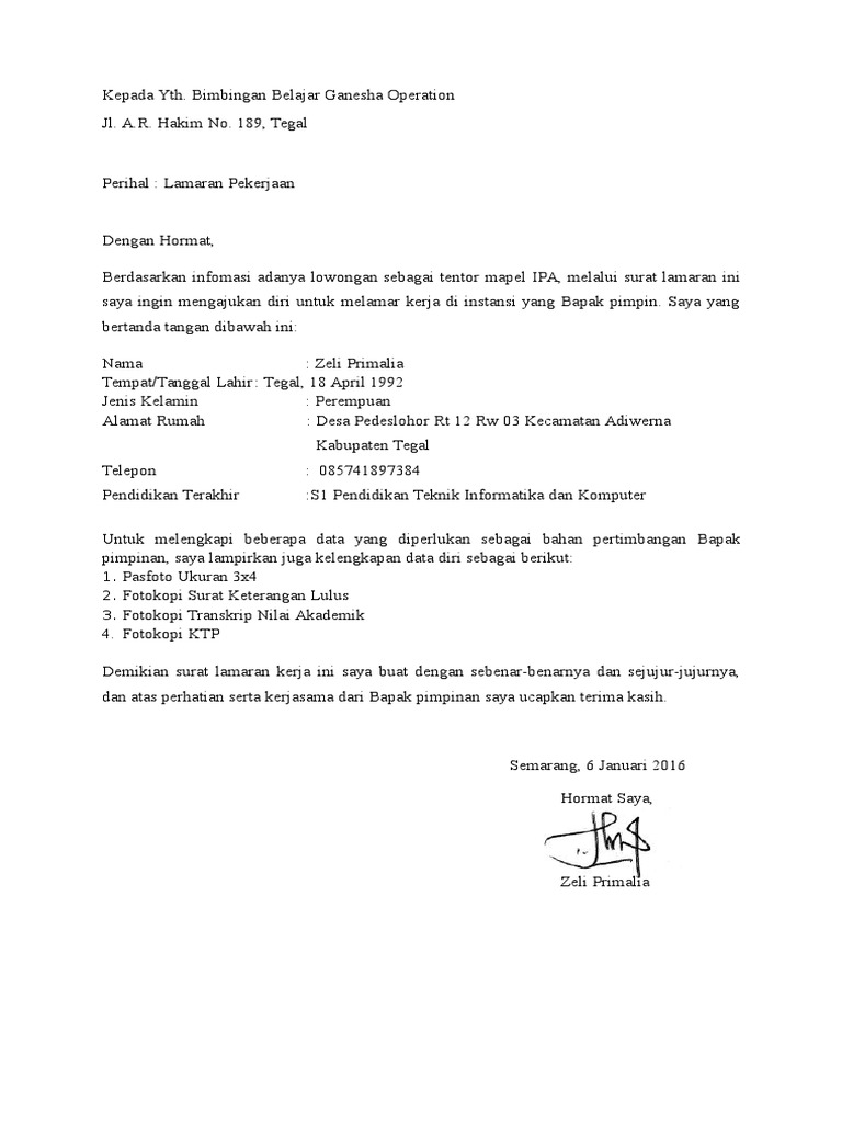 Contoh Surat Lamaran Kerja Bimbel Ganesha Operation