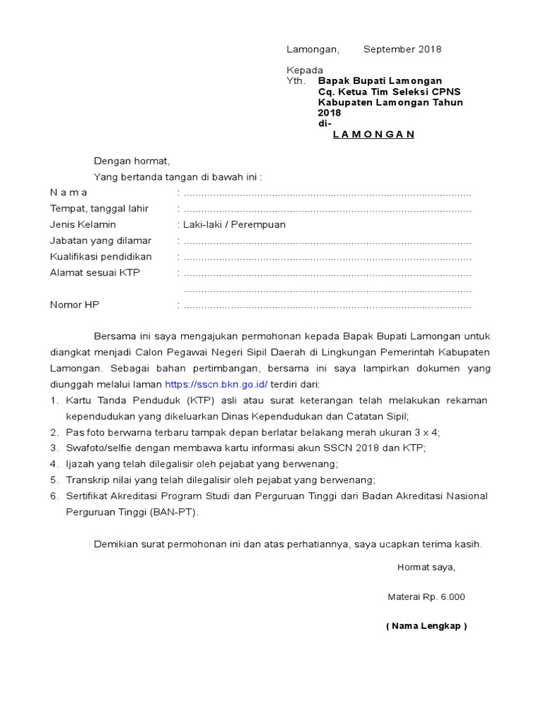 Contoh Surat Lamaran Dan Pernyataan Cpns Pemkab Karimun Sijori Kepri