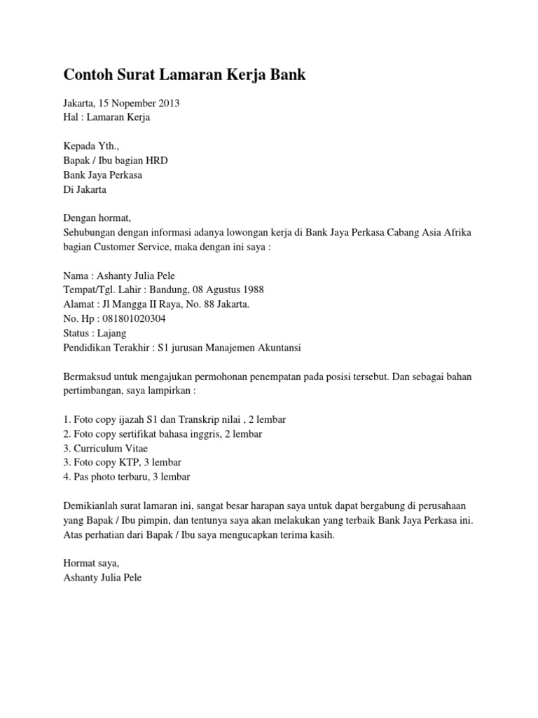 Contoh Surat Lamaran Kerja Untuk Bank Tanpa Koma