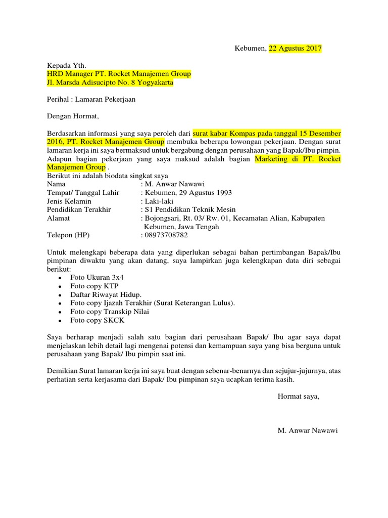 Surat Lamaran Kerja Yang Disukai Hrd Lokerjakarta Id