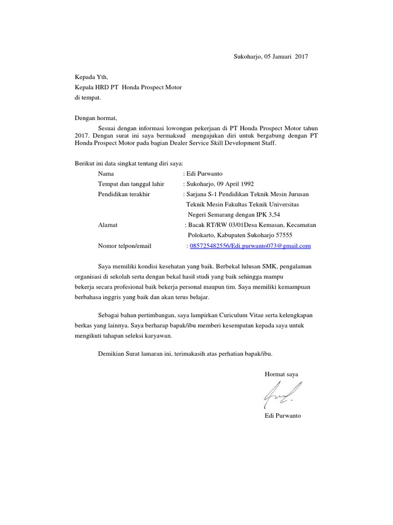 Contoh Surat Lamaran Kerja Pt Honda Prospect Motor