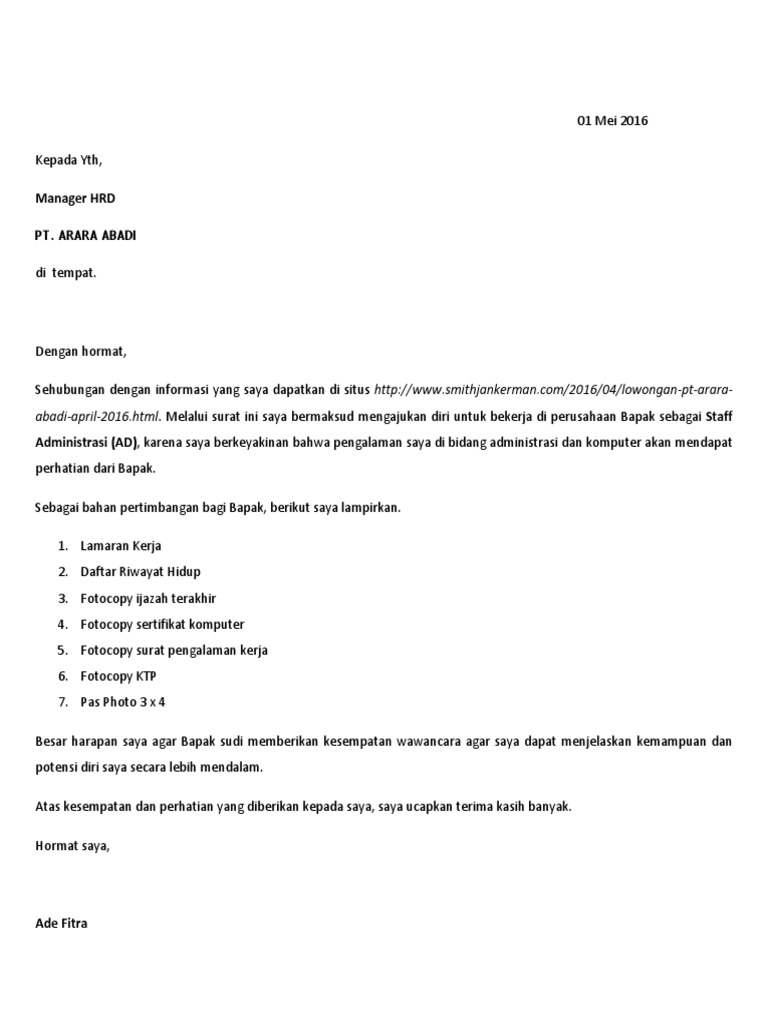 Contoh Surat Lamaran Kerja Untuk Staff Administrasi Penelusuran