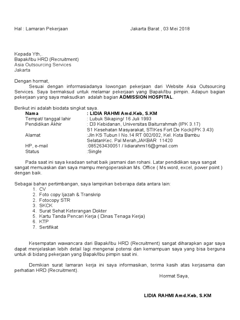 Surat Lamaran Lidia Rahmi Aos Jakarta
