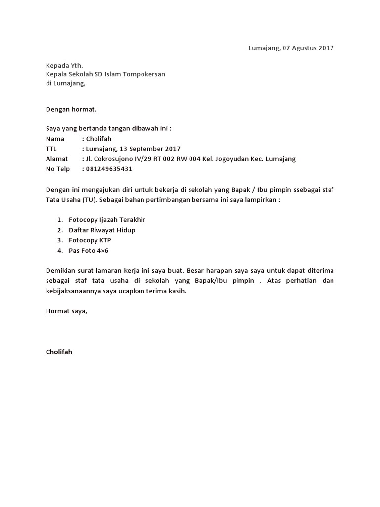 Contoh Surat Lamaran Kerja Di Sekolah Sebagai Tata Usaha