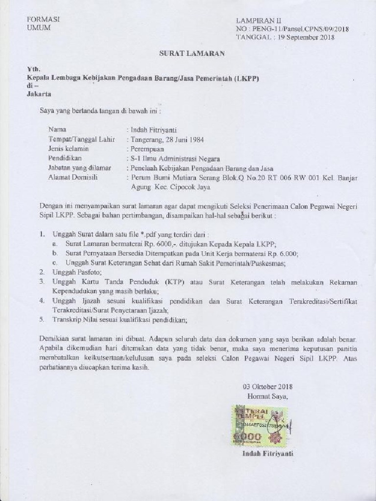 Surat Lamaran Cpns Lkpp Contoh Surat Lamaran Kerja Cpns