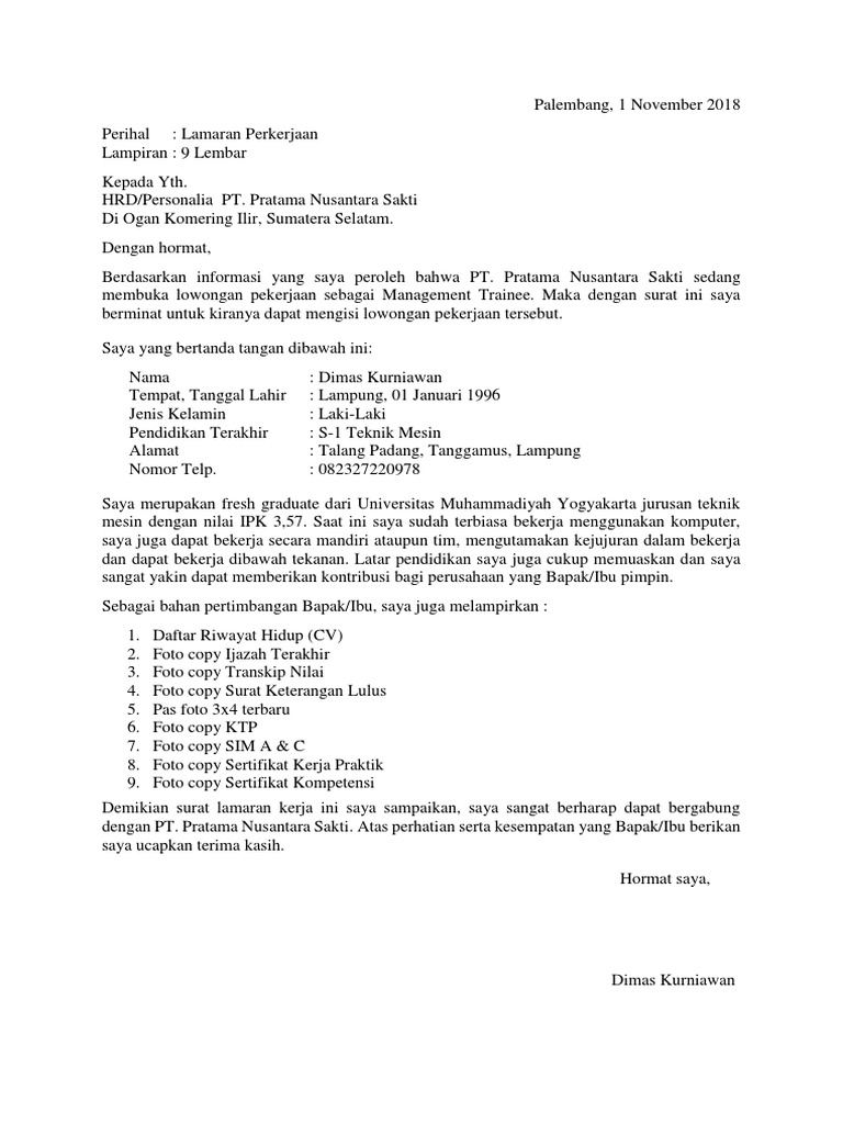 Surat Lamaran Kerja Ke Pt Tulis Tangan