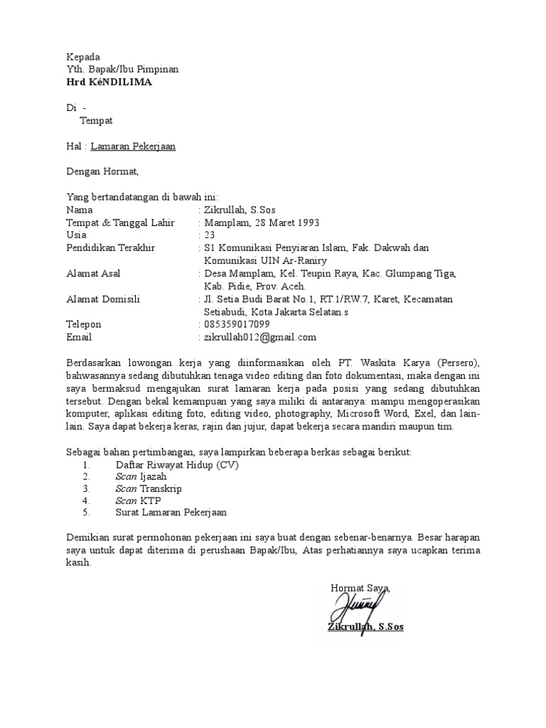 Surat Lamaran Pekerjaan Kendilima Doc