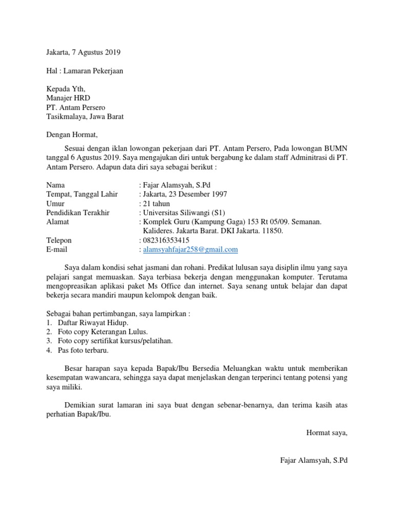 Contoh Surat Lamaran Kerja Pt Antam Backup Gambar