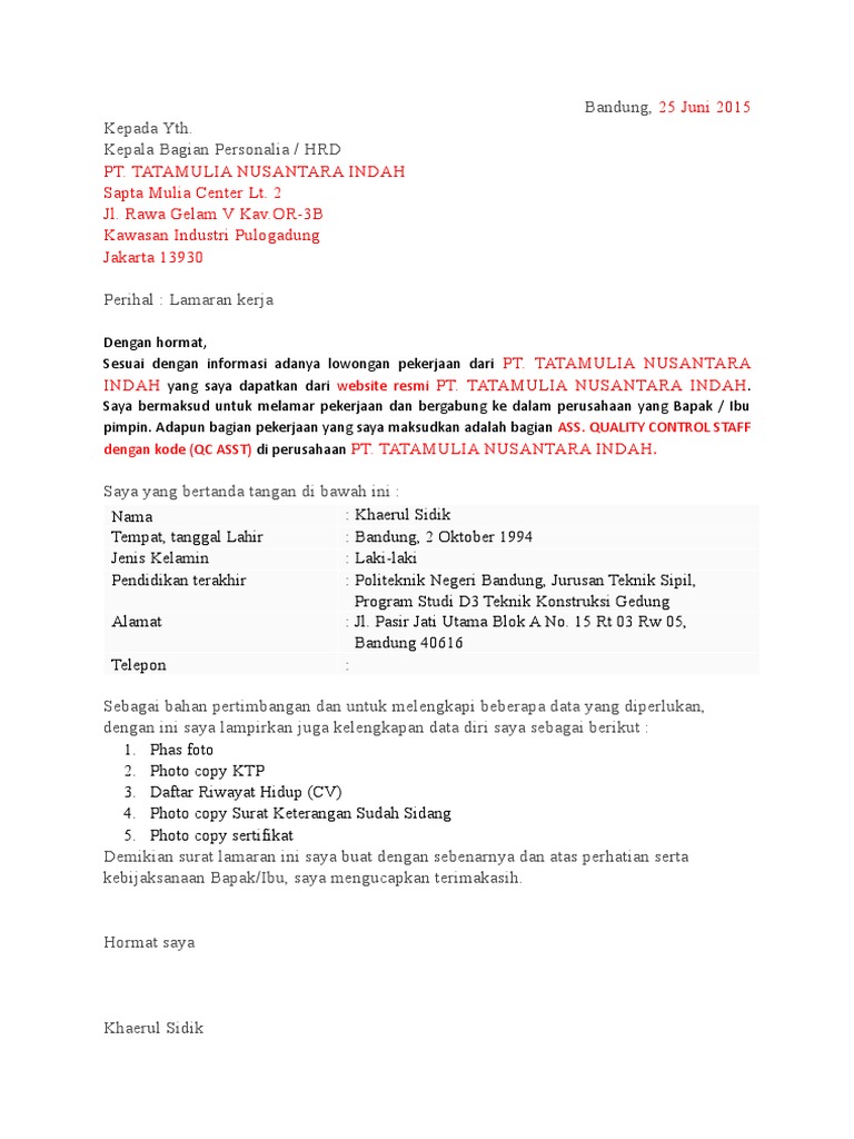 Surat Lamaran Kerja Pt Tatamulia Nusantara Indah Qc Asst