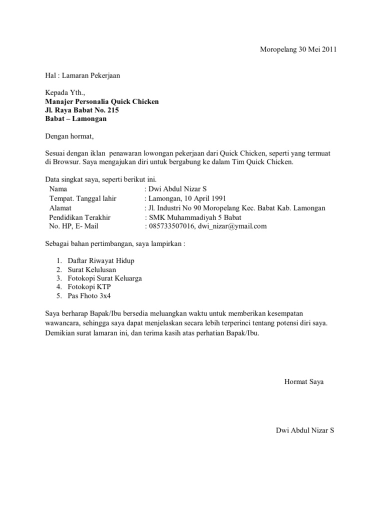 Contoh Surat Lamaran Kerja Di Quick Chicken