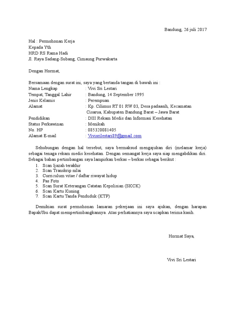 Contoh Surat Lamaran Kerja Rekam Medis Kerkosa