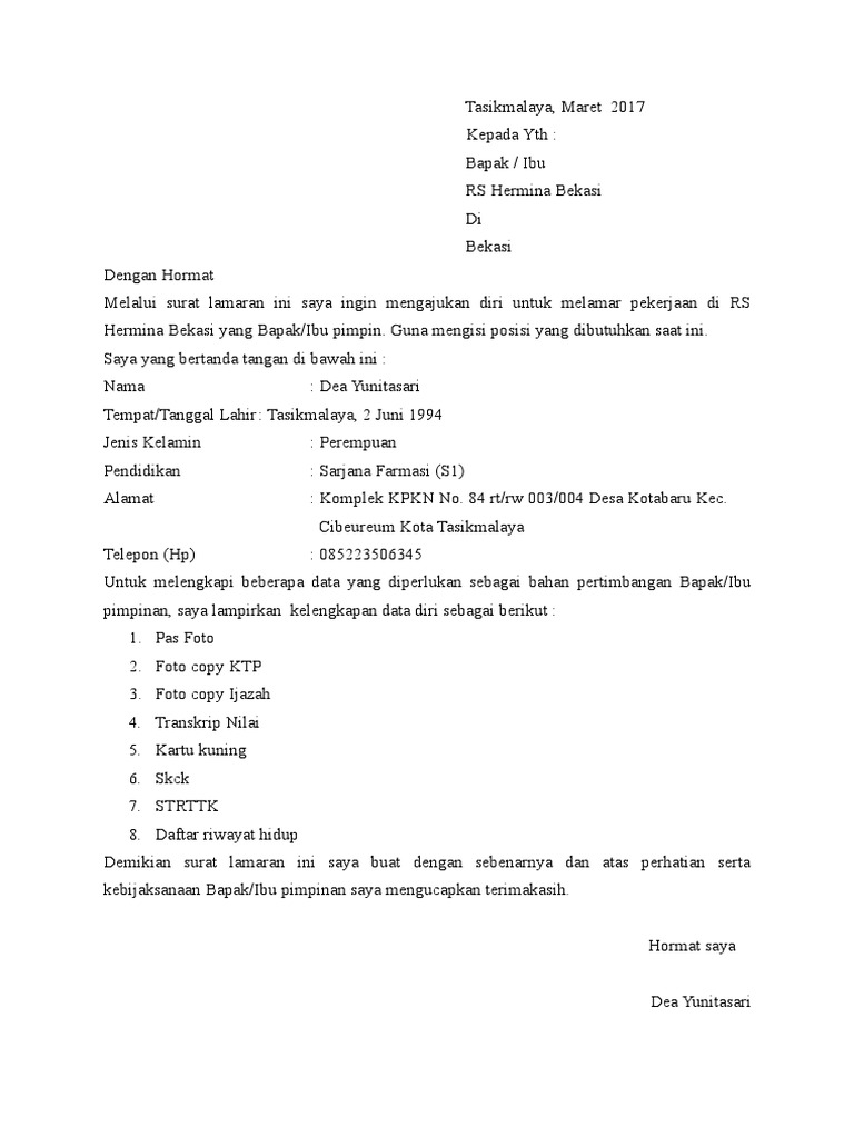 Surat Lamaran Rs Hermina Bekasi