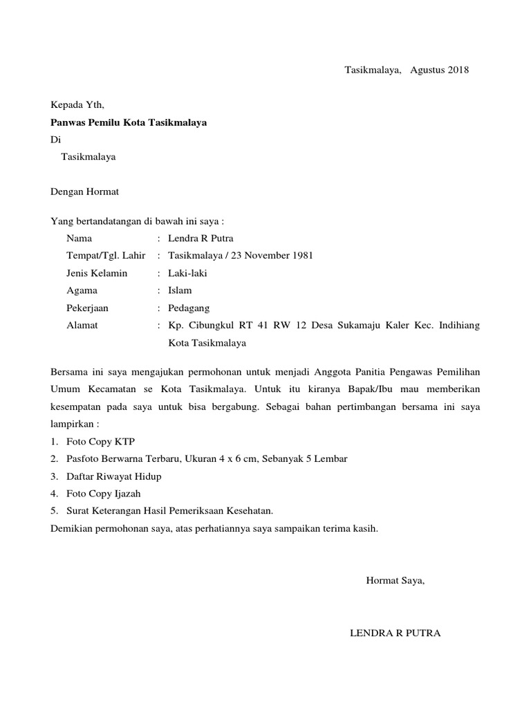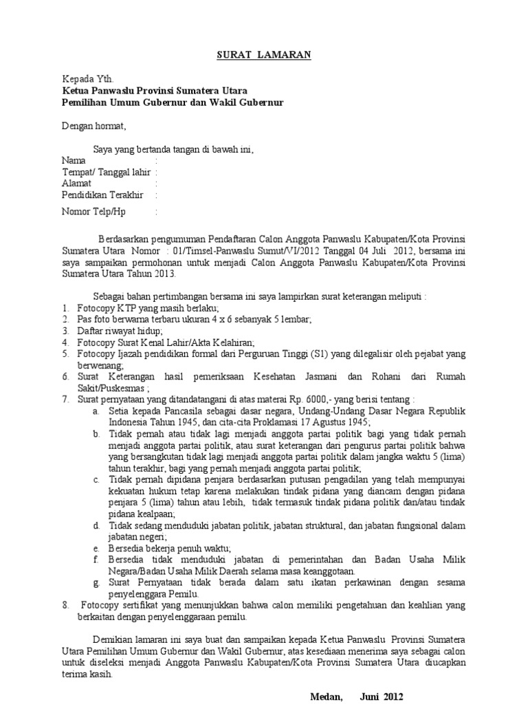 Surat Lamaran Kerja Di Panwas Pemilu Pilkada Cv