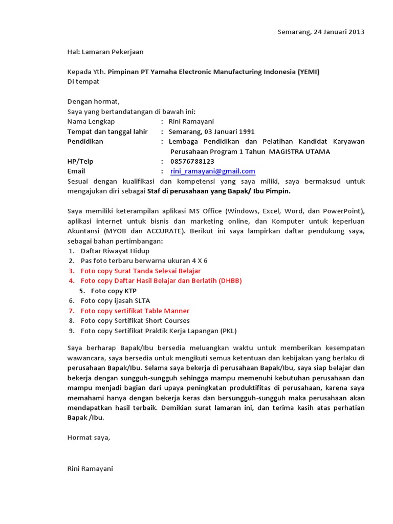 Contoh Surat Surat Lamaran Kerja Pt Yamaha